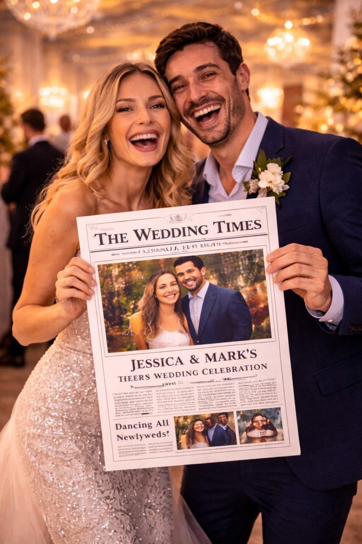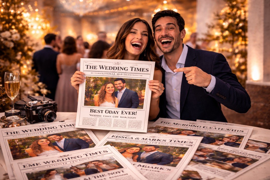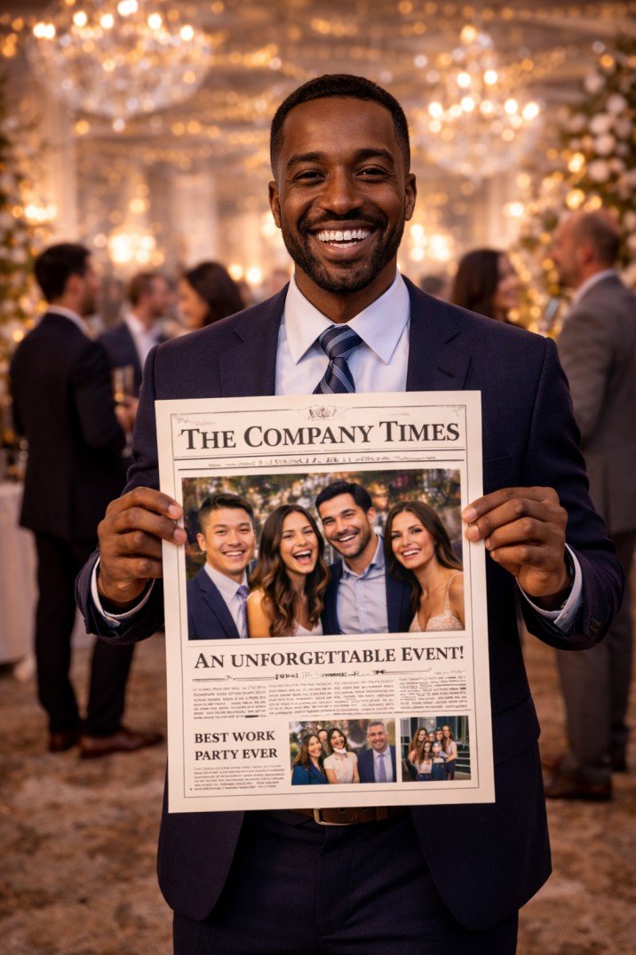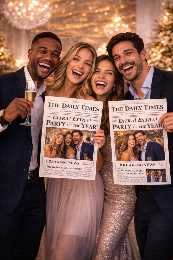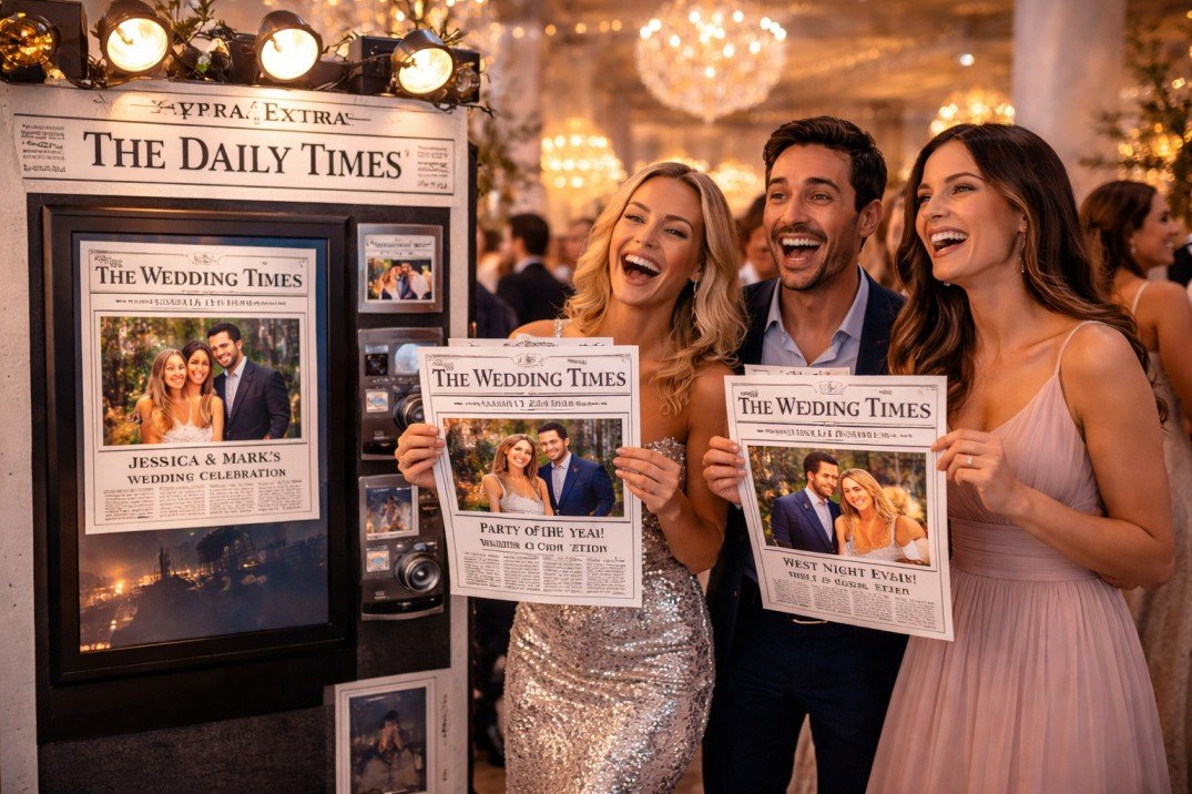 What makes the Newspaper Photo Booth Experience special is how it transforms simple photos into something creative and unexpected. Each photo is styled like a real newspaper article, placing guests at the center of the story while adding playful headlines and vintage-inspired layouts.
